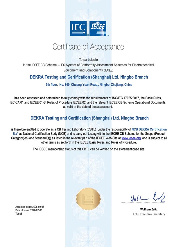 近日,DEKRA德凯宁波分公司顺利通过国际电工委员会(IECEE)的首次评审,成功获得包括灯具、家用电器、电器附件在内的多项标准CBTL资质。这一重要里程碑不仅彰显了DEKRA德凯在测试与认证领域的专业实力,也进一步强化了其对宁波及周边地区的本地化服务能力。