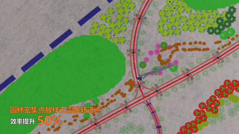 在园林绿化等密集点放样场景中,点位数量多、分布密集是常态。传统视觉放样通常一次只能选一个点或一条线,频繁切换目标打断节奏,效率损失明显。园林放样RTKX13实景放样RTK支持在CADAR实景中直接选择和放样多个点位与线型,无需频繁跳出界面重新选点;自动放样最近点功能可根据人员当前位置智能匹配目标点,减少人为判断和手动操作。在高密度点位作业中,每个点节省的几秒最终汇集成倍提升的整体效率,让测量人员真正实现“走到哪,放到哪”。据实测,密集点放样效率可提升50%。