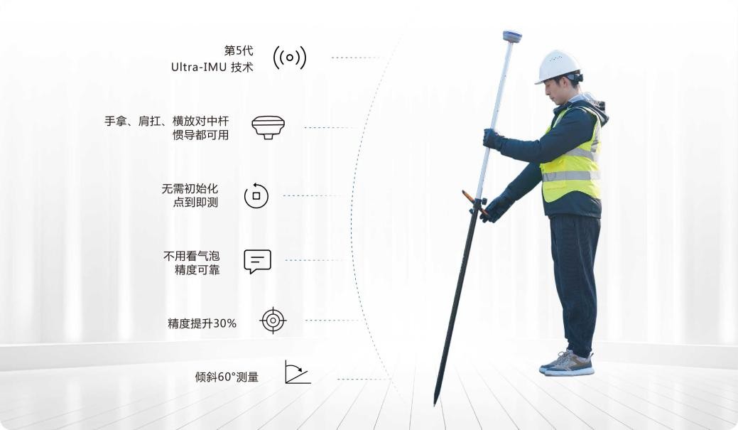 传统惯导初始化繁琐,需绕八字校准,且对中杆必须保持垂直,否则精度下降,限制了狭窄空间、斜坡等场景作业。X13实景放样RTK采用第五代Ultra-IMU无感惯导,手拿、肩抗、横放对中杆均可使用,无需初始化,点到即测,不看气泡也能测,可倾斜60°测量,操作更简便,精度提升30%,让园林放样RTK在复杂环境下依旧稳定可靠。