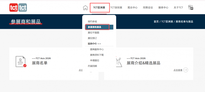 打开TCT官网首页,点击“展商名单”或“展商介绍&精选展品”即可快速查阅。
