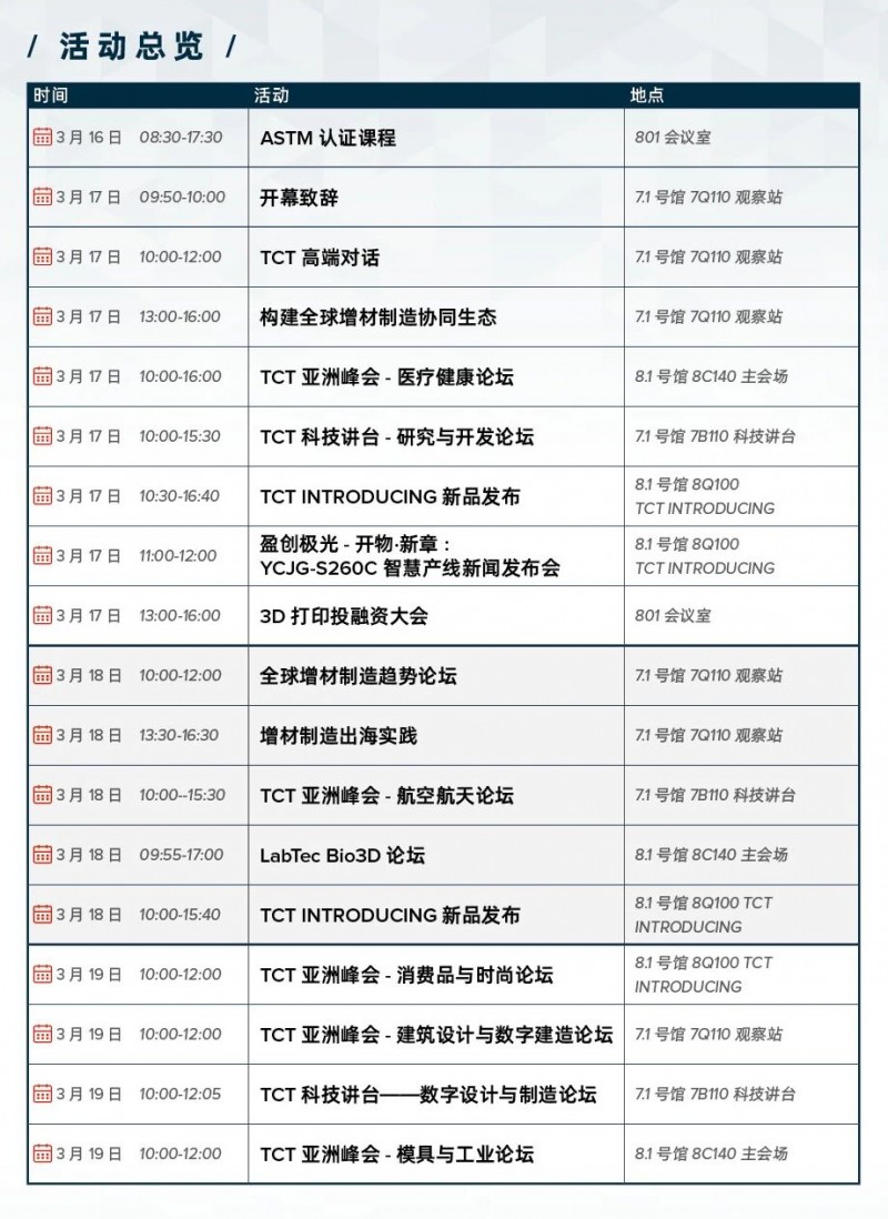 聚焦实际应用,并与展会现场展示的技术、设备相结合,打造全新的活动体验;提供专业、高度聚焦的会议、研讨会和其他专业内容,并营造交流互动的氛围;帮助设计师、工程师和买家评估、采纳和优化配置,以满足他们对于增材制造的真正需求。