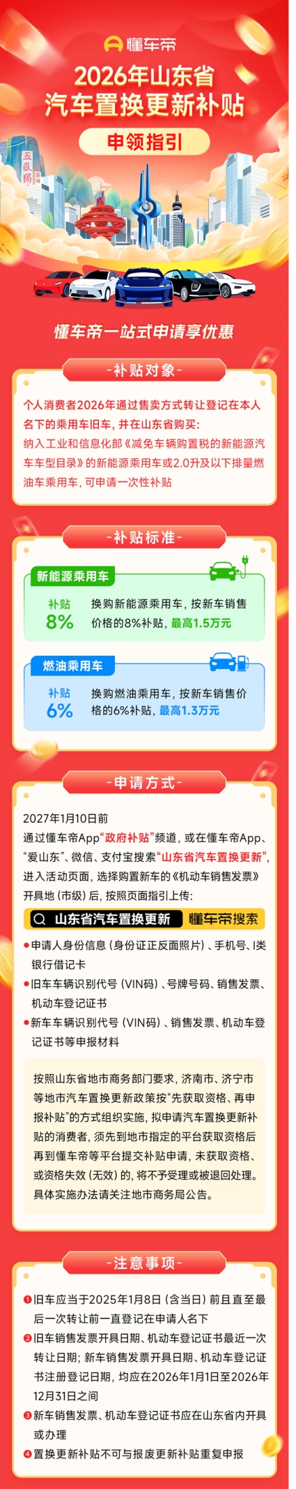 需要注意的是,按照山东省地市商务部门要求,济南市、济宁市等地市汽车置换更新政策按“先获取资格、再申报补贴”的方式组织实施,拟申请汽车置换更新补贴的消费者,须先到地市指定的平台获取资格后再到懂车帝等平台提交补贴申请,未获取资格、或资格失效(无效)的,将不予受理或被退回处理。具体实施办法请关注地市商务局公告。