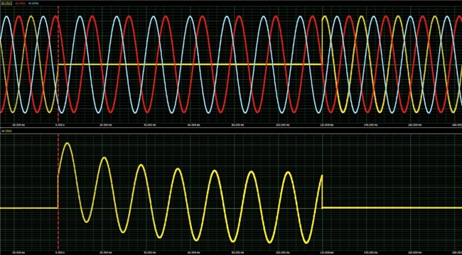 示例2展示了通过模拟电压和电流传感器输出电路故障检测的波形。上轨迹模拟了A相发生线对地故障时的三相电源电压变化,下轨迹则呈现对应的A相故障电流波形,充分体现了DDS选件在生成非正弦波形(如指数衰减电流)方面的能力。