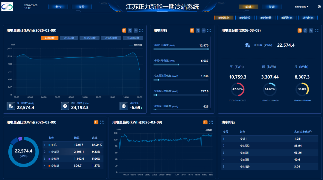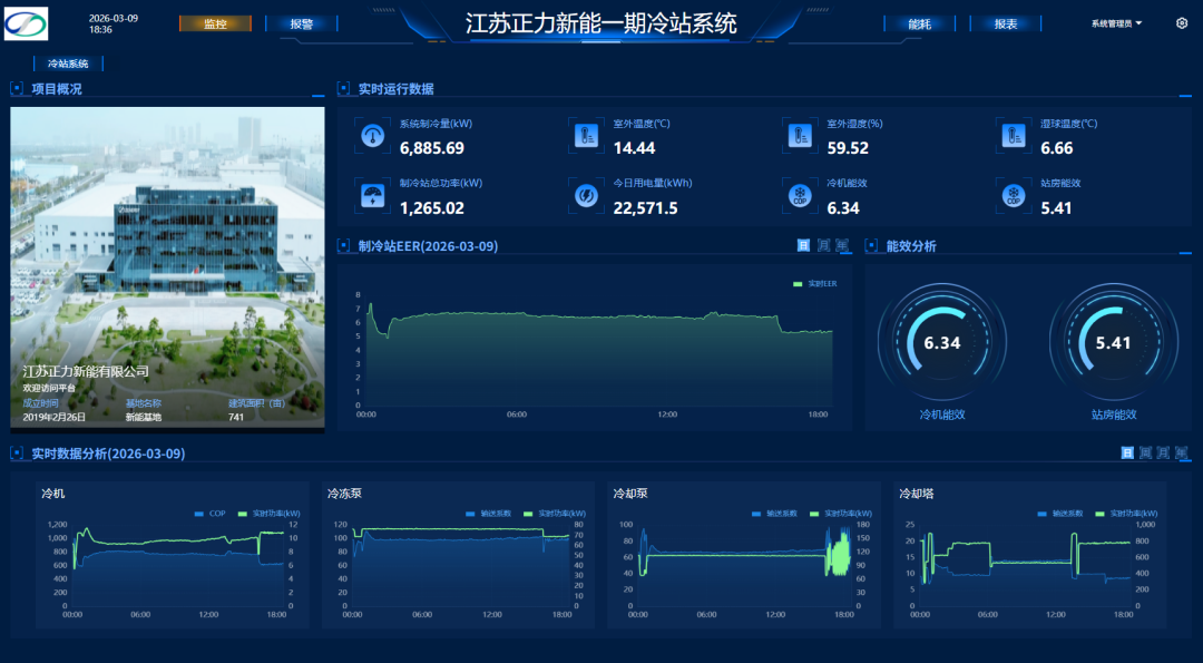 在动力电池制造中,恒温恒湿是基础条件。电芯的一致性、良率与安全性,都高度依赖稳定的环境控制。在正力新能江苏常熟厂区,中央制冷系统全年用电量超1000万kWh,是厂区最大的能源消耗单元。该系统有4台机组、4台冷冻水泵及多台冷却水泵和冷却塔,所有水泵及冷塔风机均具备变频控制能力。从设备配置来看,系统具备一定节能基础。