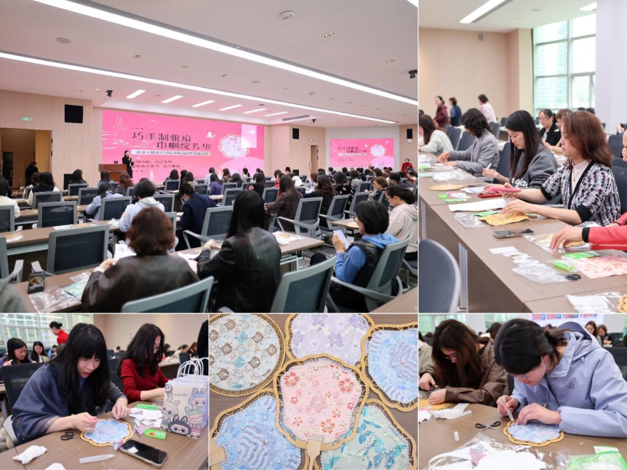 活动现场氛围轻松而热烈。女职工们暂时放下繁忙的工作,凝神专注、巧手翻飞,或精心挑选心仪的宋锦纹样,或搭配灵动的珍珠配饰,相互交流创作思路、彼此协助完善作品,将对生活的热爱、对成达大家庭的温情一一倾注于扇面之上。经过一番精心创作,一把把兼具古典雅致与个性美感的宋锦珍珠扇相继成型,大家手持亲手制作的作品拍照留影,脸上洋溢着满满的成就感与幸福感。
