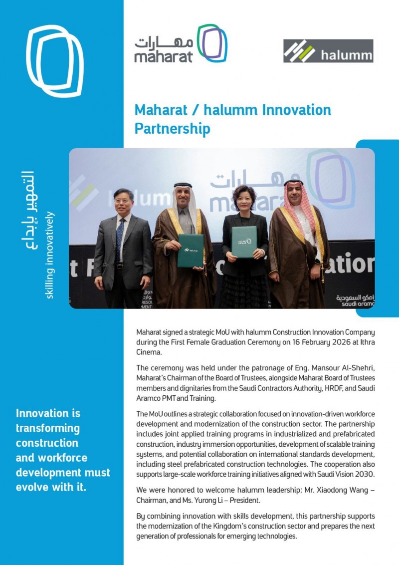 在沙特达曼阿卜杜勒阿齐兹国王世界文化中心(Ithra)首届女毕业生毕业典礼上,汉尔姆与沙特知名建筑职业教育机构Maharat签署了战略合作协议。 这不仅是一项产业职教合作,更是汉尔姆引领沙特建筑业发展,以教育赋能本土工人提高技能、践行公益初心的重要实践。
