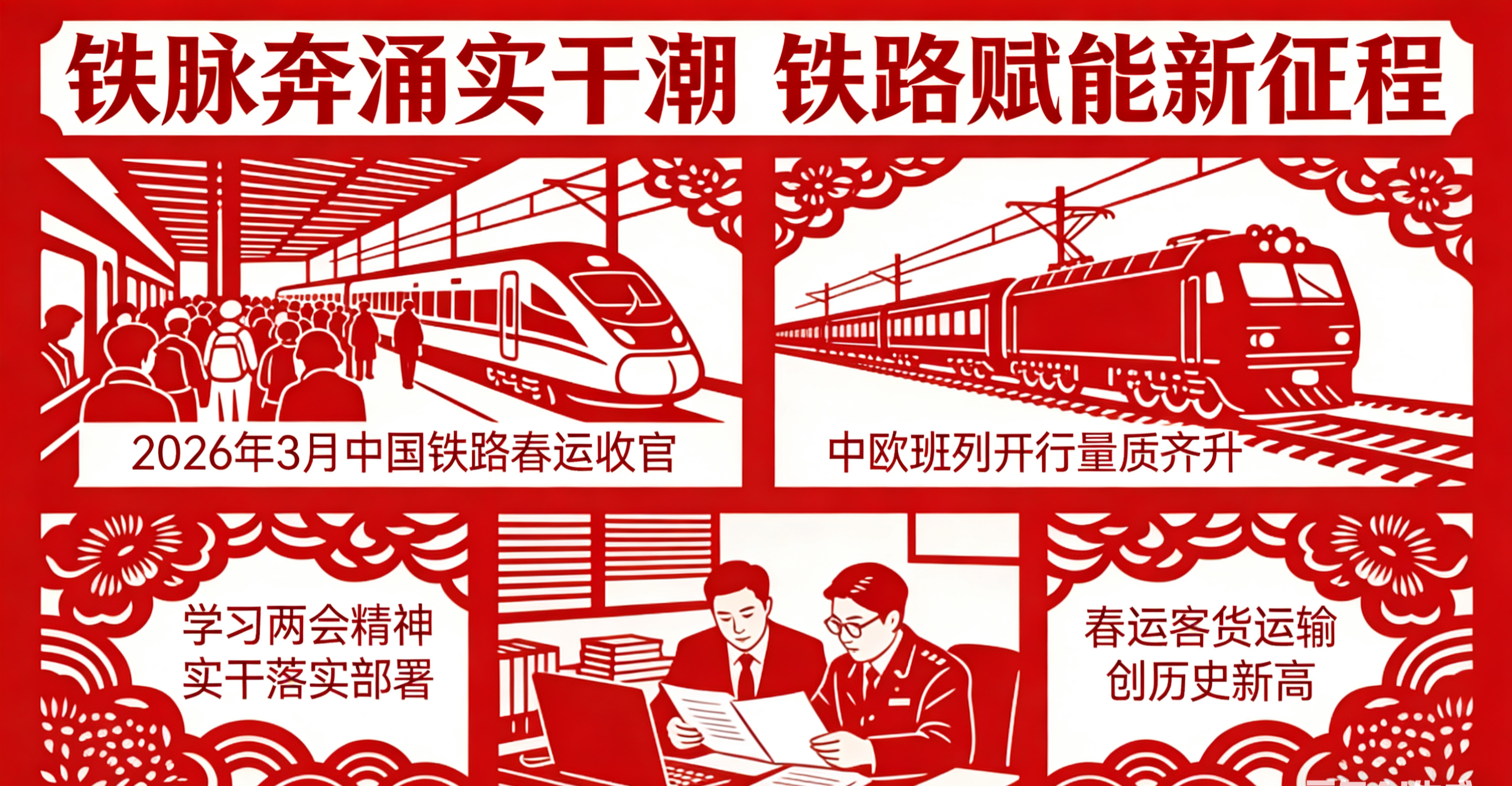 春潮澎湃处,奋进正当时。2026年3月,中国铁路传来一系列亮眼消息,为期40天的春运圆满收官,客货运输多项指标创历史新高;全路迅速掀起学习贯彻全国两会精神热潮,各地铁路单位以实干把两会部署落到实处;1至2月中欧班列开行量质齐升,为高水平对外开放再添动能。从春运大考的完美答卷,到两会精神的落地生根,中国铁路以硬核实力与暖心服务,在十五五开局之年跑出加速度,为中国式现代化建设注入强劲铁路力量。