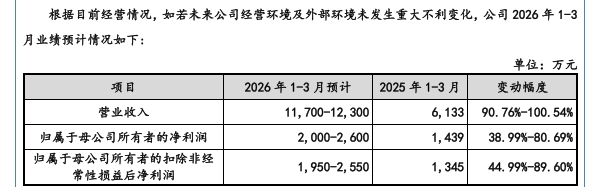 在最新上会版招股书中,广泰真空预计业绩将持续迎来爆发。公司预计 2026 年 1-3 月营业收入为 1.17 亿元至 1.23 亿元,同比增长 90.76% 至 100.54%;预计归属于母公司所有者的净利润为 2000 万元至 2600 万元,同比增长 38.99% 至 80.69%。