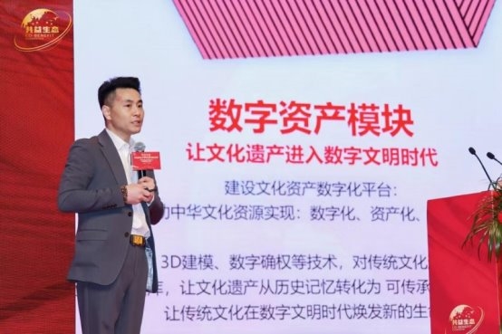 该生态以“数字驱动、文化共生、链接全球”为核心思想,构建了一个集内容发行、版权运营、资产交易、金融赋能、产业联动、跨境分发于一体的全产业链数字文化平台。中国智慧工程研究会智慧文化应用专业委员会主任唐俊对共益生态的战略布局进行了系统解读,提出以“一体为基、利他为益”为核心准则,构建共生共荣的文化生态体系,推动中国文化从产品输出向价值输出转变。他还介绍,共益生态打造了四大核心系统与四大模块协同发展的架构,以生命体矩阵的形式实现资源共享、多方赋能,为文化数字化发展与全球传播提供系统性的解决方案。共益生态体系代表安然阐述了共益生态项目之间如何协同赋能地方发展。