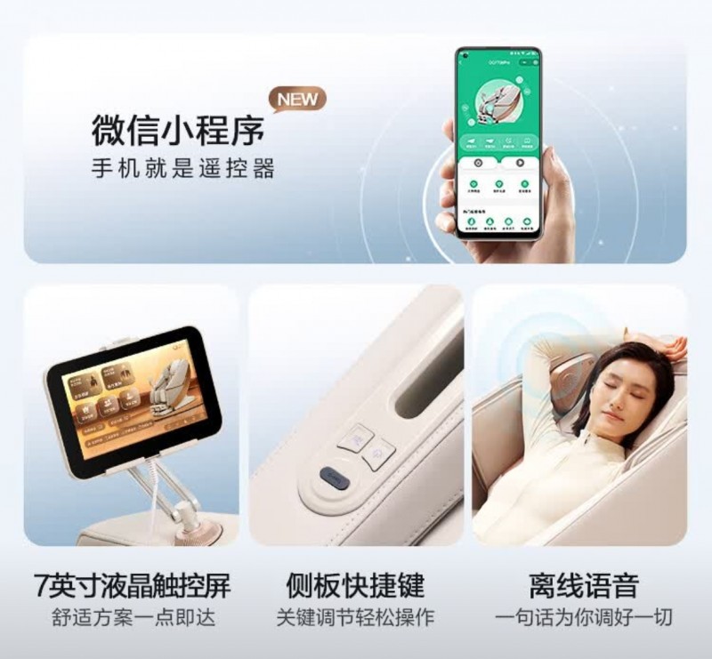 一直以来,奥佳华都以用户的需求为设计导向,本次新品7708Pro更是将这一理念贯穿于方方面面。内置32套程序 ,7英寸液晶触控屏/快捷键/语音/微信小程序 4种操控,满足不同家庭成员的按摩需求和使用习惯;小腿智能防夹感应、儿童锁 等大幅提升安全系数;还有蓝牙直连、Type-C接口充电、手机收纳和三折叠支架 等超多人性化设计,让日常按摩更智能、更舒适、更高效。