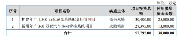 本次IPO,公司拟募集资金3.8亿元,主要用于两大核心产能扩建项目,进一步强化在汽车精密管件领域的规模优势与产品布局。其中,年产1500万套底盘系统配套用管扩建项目总投资3.04亿元,建设周期2年,拟使用IPO募资2.5亿元,项目建成后预计可年产电控减震器组件1000万套、稳定杆管件500万套;另一新增年产360万套汽车转向管柱系统项目总投资2.74亿元,建设周期3.5年,拟投入IPO募资1.3亿元。两大募投项目将有效补齐公司产能短板,适配新能源汽车与高端底盘部件快速增长的市场需求。