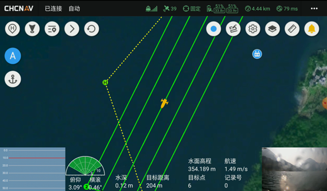 华微4号无人船采用0.3m超浅吃水设计,搭配HQ-400多波束最大140°的扫测开角与150m测深能力,可实现航道近岸、浅滩及深槽区域的连续覆盖,彻底解决传统测量船“进不去、测不全”的难题。在作业效率方面,依托EasySail无人船控制软件,工作人员将DXF格式的范围线文件导入到遥控器中,即可快速规划航线。一键调节航向与航线间距,确保多波束采集条带重叠率高于20%。无人船按照预设航线自动走航,无需人工频繁干预,3小时即可完成数百亩至0.7km²水域的扫测任务,效率较传统测量船提升约3倍,大幅减少人员投入与安全风险。