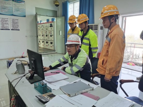 巡检人员与3名青工在分析数据 (黄金水 摄)
