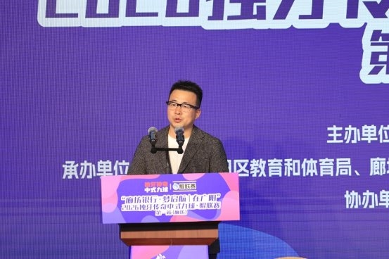 在致辞环节,独牙控股集团董事长乔冰率先登台讲话。他代表独牙台球集团向远道而来的青少年球员及家长致以最热烈的欢迎,向廊坊市广阳区人民政府、廊坊市体育局及廊坊银行等各合作单位致以感谢,特别感谢廊坊市广阳区人民政府对鲲联赛的大力支持与悉心指导。他表示,赛事以“鲲”为名,寄寓鹏程万里之志,致力于打造属于青少年自己的顶级中式九球赛事IP,为健康中国与体育强国建设贡献一份力量。同时,乔冰董事长期待以本次赛事为起点,与广阳区深化合作、携手同行,共同书写中国青少年台球的新篇章。