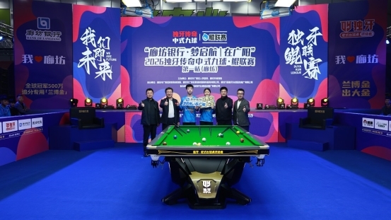 致辞结束后,开幕式迎来激动人心的开球仪式。廊坊市广阳区政府区长王振宇、廊坊市体育局党组刘武、廊坊银行党委、董事长崔建涛、独牙控股集团董事长乔冰携手球员代表姜旭桐、邢开杰共同手持球杆,在全场倒计时中合力开球,清脆的撞击声在馆内回荡,标志着“ 廊坊银行·梦启航|在广阳”2026独牙传奇中式九球·鲲联赛第一站(廊坊)正式开赛。