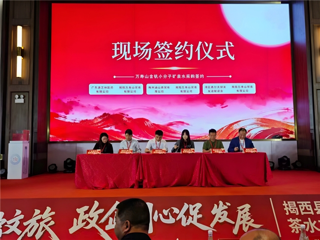 签约仪式上,多家企业达成合作协议,涵盖茶叶采购、矿泉水销售及文旅项目开发三大领域。其中,“大洋红”茶叶与多家采购商签约,万寿山矿泉水成功和各地经销商签约,樱花茶园文旅项目和多个旅游合作项目也正式落地。此外,揭阳市万寿山贸易有限公司被授予“揭阳市大健康产业协会副会长单位”称号。活动的压轴环节是“云顶茶市”启动仪式。与会领导嘉宾共同按下启动屏幕,标志着揭西县茶产业与文旅融合迈入新阶段。