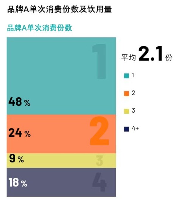 我们发现,针对即饮咖啡的单次消费中,受访者平均单次饮用2份,平均消费量为14.3盎司。而品牌A的用户平均单次饮用2.1份,平均消费量达16.0盎司。由此可见,品牌A的消费者单次饮用量已达峰值,无法通过提升单次饮用量来实现增长。