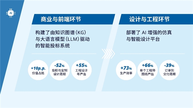 在商业与前端环节,伊顿构建了由知识图谱(KG)与大语言模型(LLM)驱动的智能投标系统,应对 ETO 投标中规格多样、隐性需求多、响应速度要求高等挑战。系统基于超过五万个模块进行智能配置,通过 RAG(Retrieval-Augmented Generation,检索增强生成) 技术准确理解客户需求,给出配置与风险建议,并自动生成定制化投标文件,使中标率提升 10 % ,工程设计年产出提升 55% ,投标与定制设计周期缩短 52% 。