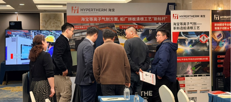 在会议现场的展台区域,海宝展示了等离子气刨与坡口切割的应用工件,直观呈现了等离子气刨在槽型一致性、表面光洁度及自动化适配方面的显著优势。多家船厂的参会代表在现场进行了深入交流,并对海宝等离子气刨在改善作业环境、降低用工门槛、提升生产效率等方面的实际效益表示高度认可。
