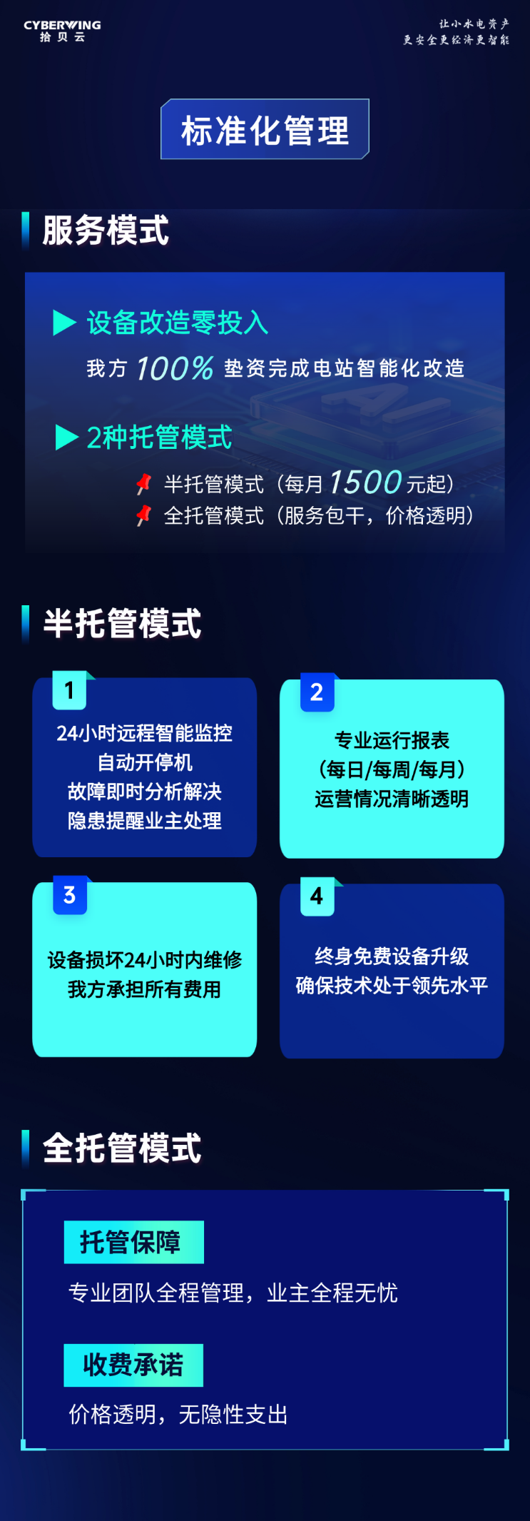 对标“统一流程、技术标准和服务规范,构建与新型电力系统相适配的运维管理新模式”等政策要求,拾贝水利水电以100%全额垫资为核心优势,提供半托管、全托管两种服务模式 ,实现电站智能化改造零成本、运维管理标准化。
