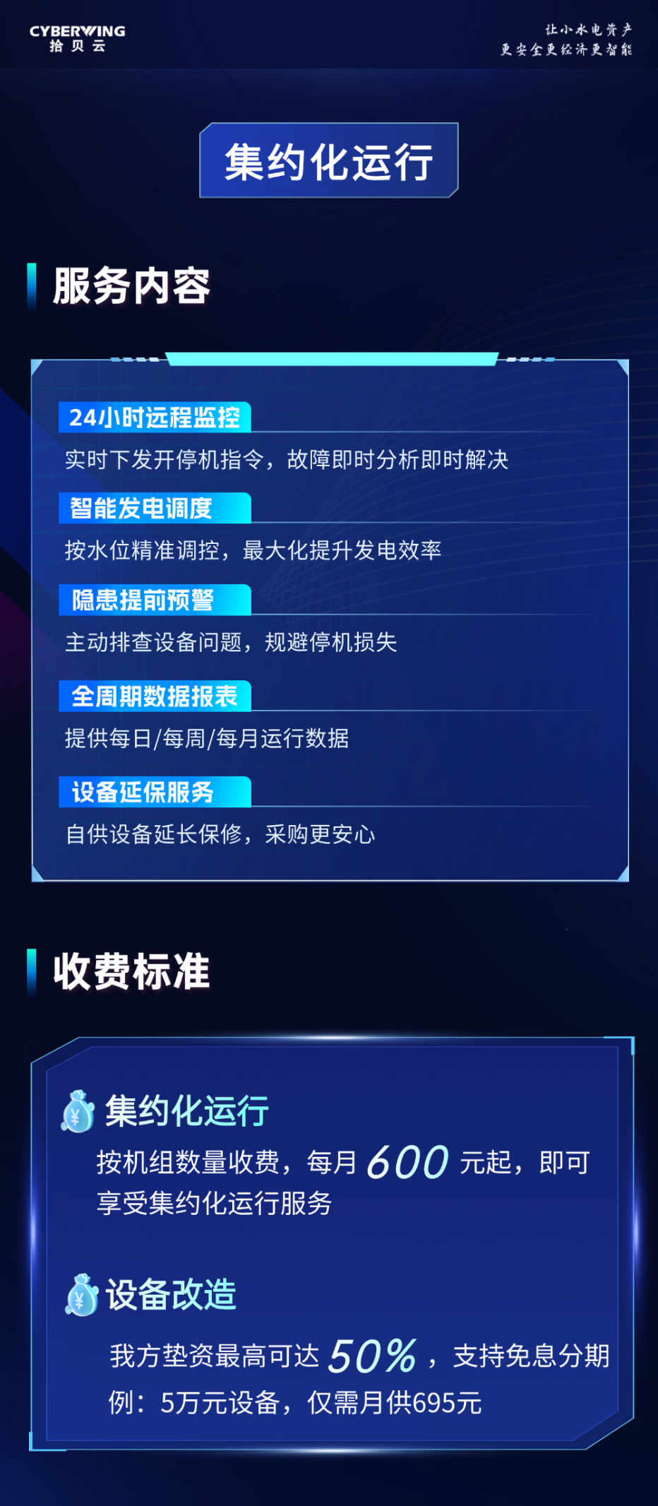 政策提到,以流域/区域为单元,打造专业集控平台与智能运维中心,高效接入小水电站群,实现信息共享与协同调度。拾贝水利水电推出小水电集约化运行服务,涵盖 24小时远程监控、自动开停机,故障即时分析解决、主动排查设备运行隐患并提前预警、每日/每周/每月专属运行报表、设备延保等多项服务,设备改造最高可垫资50%并支持免息分期 ,助力电站实现"少人值守、远程精准控制、联合优化调度",显著提升防汛响应、安全保障、发电效益、生态流量保障等能力。
