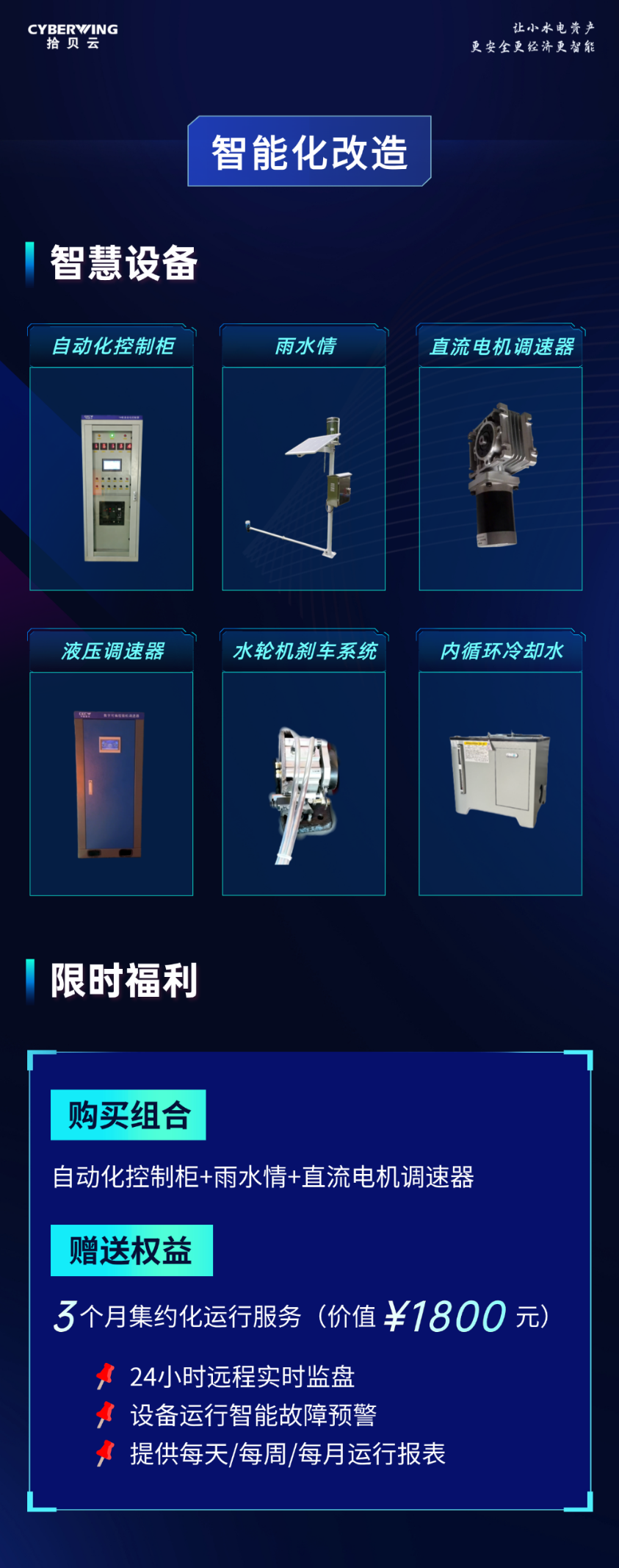 严格落实“系统开展机电设备等设施设备更新改造、推进小水电智能化升级” 等政策要求,拾贝水利水电 提供 政策适配的自动化控制柜、雨水情、直流电机调速器、液压调速器、水轮机刹车系统、内循环冷却水等核心硬件 ,即装即用。购买组合装(自动化控制柜+雨水情+直流电机调速器)加赠价值1800元的3个月集约化运行服务 ,覆盖24小时远程实时监盘、设备运行智能故障预警,提供每日 / 每周 / 每月运行报表,结合小水电核心硬件,可根据降水、来水以及调度要求、生态流量需求,实现自主开停机、蓄放水、负荷动态优化调节、趋势预警等,全面筑牢智能运行基础。