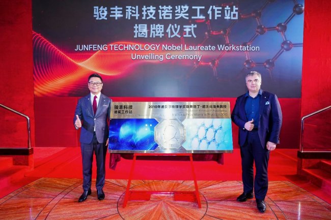在发布会现场,陈险峰董事长与康斯坦丁·诺沃肖洛夫教授共同为“骏丰科技诺奖工作站”揭牌,标志着这一国际科研合作平台正式成立。