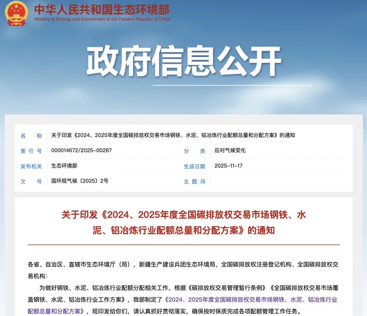 《2024、2025年度全国碳排放权交易市场钢铁、水泥、铝冶炼行业配额总量和分配方案》正式发布!