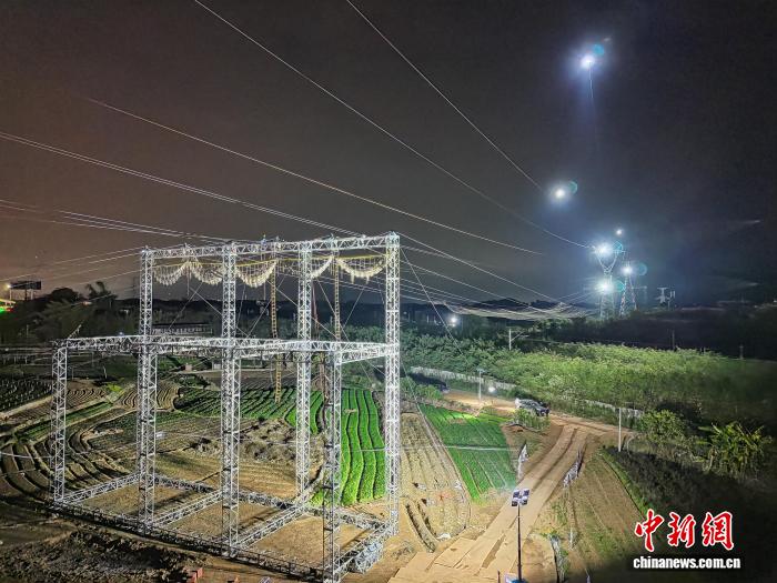中新网南宁2月5日电(杜冰韦露林洁琪)南方电网广西电网公司5日介绍,近日,在南宁邕北铁路沿线上空,20多名电网施工人员在高耸的铁塔之间展开了一场与时间赛跑的“穿针引线”,连续6个深夜,广西电网500千伏新江变电站配套220千伏送出工程(标段一)最复杂、最关键的一环——跨越3条铁路交通干线,顺利完成施工,向工程投运迈出最关键的一步。