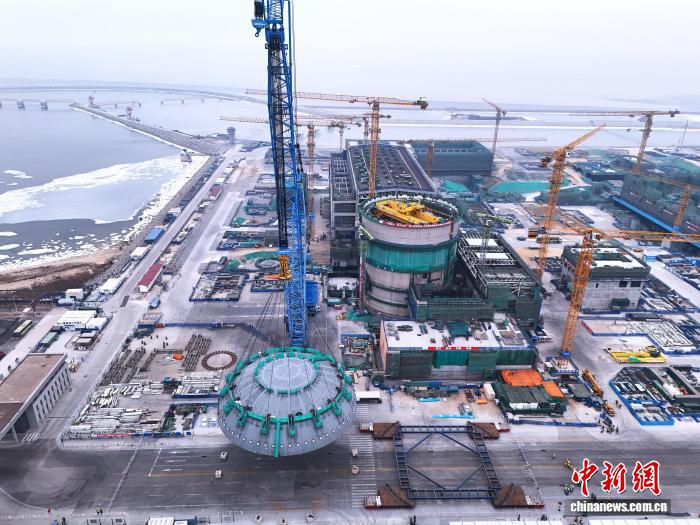 2月10日,中国最北端核电基地——辽宁徐大堡核电项目1号机组核岛钢制安全壳顶封头吊装就位。(中核辽宁核电有限公司供图)