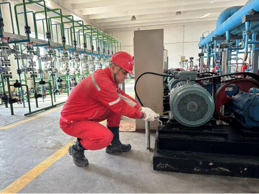 在注聚现场,青年员工李宁生手持加力扳手,俯身紧盯设备螺丝,手臂发力、动作精准,每一次拧动都力求将螺丝紧固到位。“设备长期运转螺丝容易出现松动,这不起眼的螺丝要是松了,可能引发注聚泵故障,必须逐个检查、拧紧。”李宁生一边操作,一边向身边同事强调。他顺着注聚泵流程逐一排查,加力扳手在手中灵活转动,从泵口到底座固定螺丝,不放过任何一个可能存在隐患的部位,用细致操作将安全风险“掐灭”在萌芽状态。