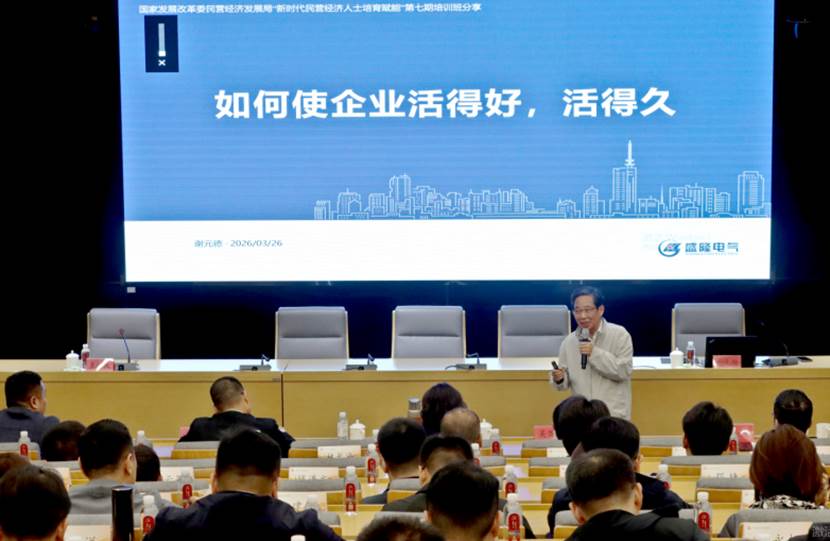 26日,盛隆电气集团董事长谢元德受邀在培训班作分享。谢元德以《如何使企业活得好,活得久》为题,结合盛隆47年创业发展经历,总结凝练出盛隆“三张名片”,分享企业活得好、活得久的经验。