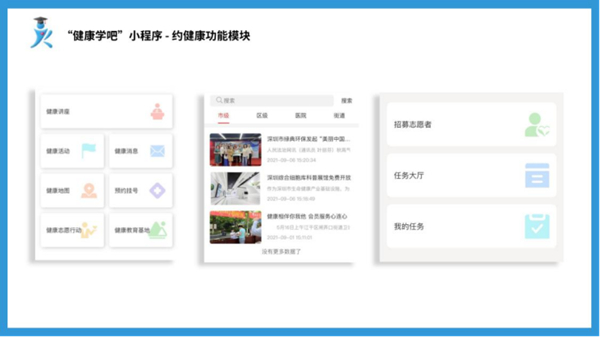2021年“健康学吧”结合市民的需求新增了竞赛类、视频音频、健康管理、公益类、信息发布等多方面功能,同时还优化了我们的王牌项目(测评和学习)模式等多个板块的功能及丰富内容,目前仍在不断的优化中。