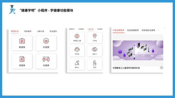 学习健康素养知识,从健康学吧开始吧。这里有丰富的健康科普视频、音频、文章、游戏、试题在学健康板块。无论大家是年轻人、老年人还是孕妇,无论大家是对中医、安全急救还是妇幼保健感兴趣,学健康功能模板都能满足大家对健康素养的需求。