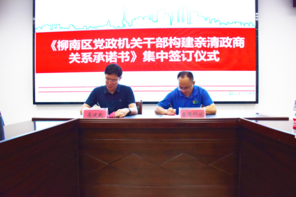 6月15日,柳南区清廉企业建设工作小组召开工作推进会,研究部署下一步清廉企业建设相关工作,工作小组各成员、参会企业代表在现场分别签订了首批《党政机关干部构建亲清政商关系承诺书》和《企业构建亲清政商关系承诺书》。