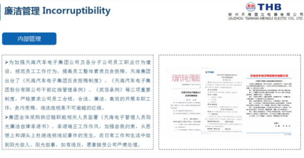 天海集团作为其中的先驱者,在制度建设狠抓执行,集团内部先后出台了《反贪拒贿制度》《干部红线管理制度》《奖惩条例》,积极与客户签订《廉洁协议》,与供应商签订《阳光协议》,全体采购供应链相关人员统一签署《阳光廉洁自律承诺书》,详细定义了各种受贿、索贿行为,一经出现,严肃处理,使清廉建设贯穿到集团生产、经营、管理、销售等各领域各环节,融入企业文化建设中,提醒员工照章办事,摒弃各种“潜规则”和“暗箱操作”。