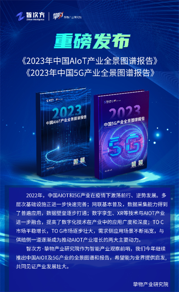 作为年会的“重头戏”,挚物产业研究院在本次大会上发布了重磅研究成果——《2023年中国AIoT产业全景图谱》(中英文双语版)、《2023年中国5G产业全景图谱》、《2023年中国AIoT产业全景图谱——无源物联网子图谱》与《2023年中国AIoT产业全景图谱——工业互联网子图谱》,帮助产业梳理市场竞争格局,为相关机构与企业决策提供参考。