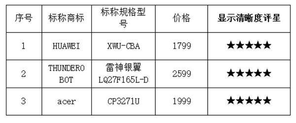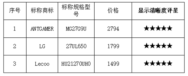 综合来看,有6款显示器样品在显示清晰度方面表现优异,获得5星。其中,4K显示器清晰度表现优异的样品包括ANTGAMER(标称规格型号:MG27G9U)、LG(标称规格型号:27UL650)、Lecoo(标称规格型号:HU21270UH0);2K显示器清晰度表现优异的样品包括HUAWEI(标称规格型号:XWU-CBA)、THUNDEROBOT(标称规格型号:雷神银翼LQ27F165L)、acer(标称规格型号:CP3271U)。