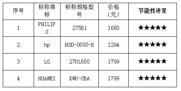 综合来看,有4款显示器在节能性方面表现优异,分别是PHILIPS(标称规格型号:275B1)、hp(标称规格型号:HSD-0093-K)、LG(标称规格型号:27UL650)、HUAWEI(标称规格型号:XWU-CBA)。