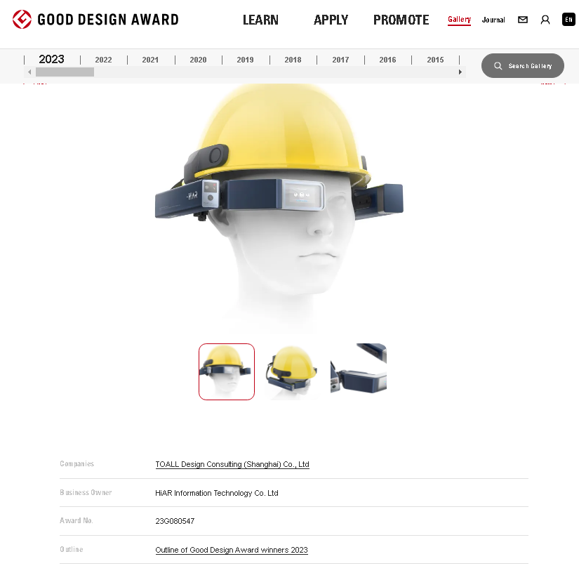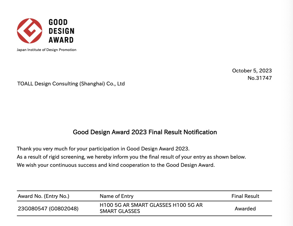 近日世界顶级设计奖之一GOOD DESIGN AWARD已于10月5日公布了2023年度获奖者名单。 TOALL凸凹设计的HiAR H100 5G AR SMART GLASSES在全球5447件参赛作品中脱颖而出,荣获GOOD DESIGN AWARD 2023年度的优秀设计奖。