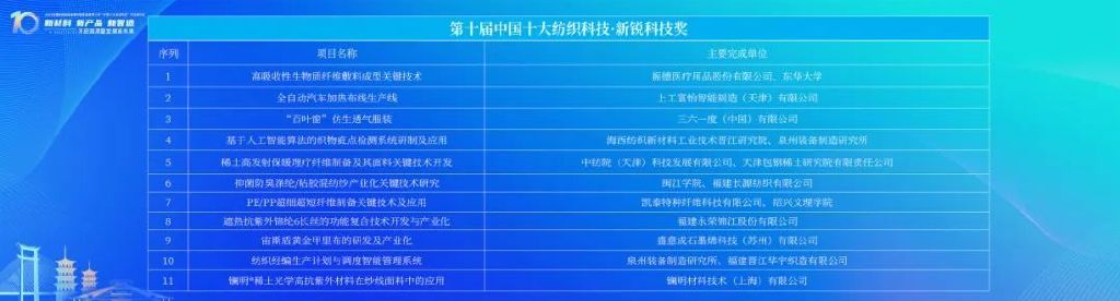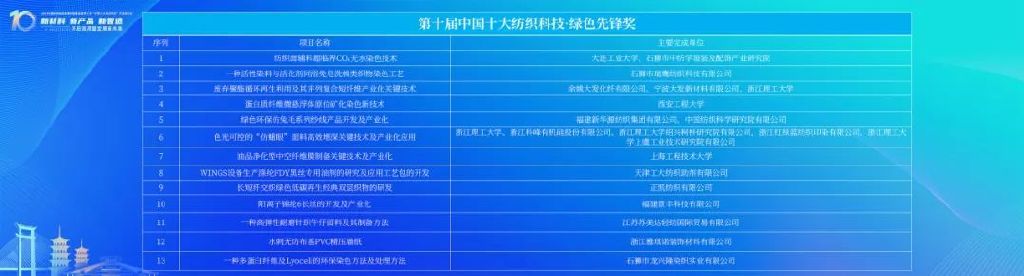 高吸收性生物质纤维敷料成型关键技术等11个项目获得“中国十大纺织科技·新锐科技奖”;防护用闪蒸法聚乙烯非织造布的产业化及其在核工业领域的应用等13个项目获得“中国十大纺织科技·产业推动奖”;纺织面辅料超临界CO2无水染色技术等13个项目获得“中国十大纺织科技·绿色先锋奖”。