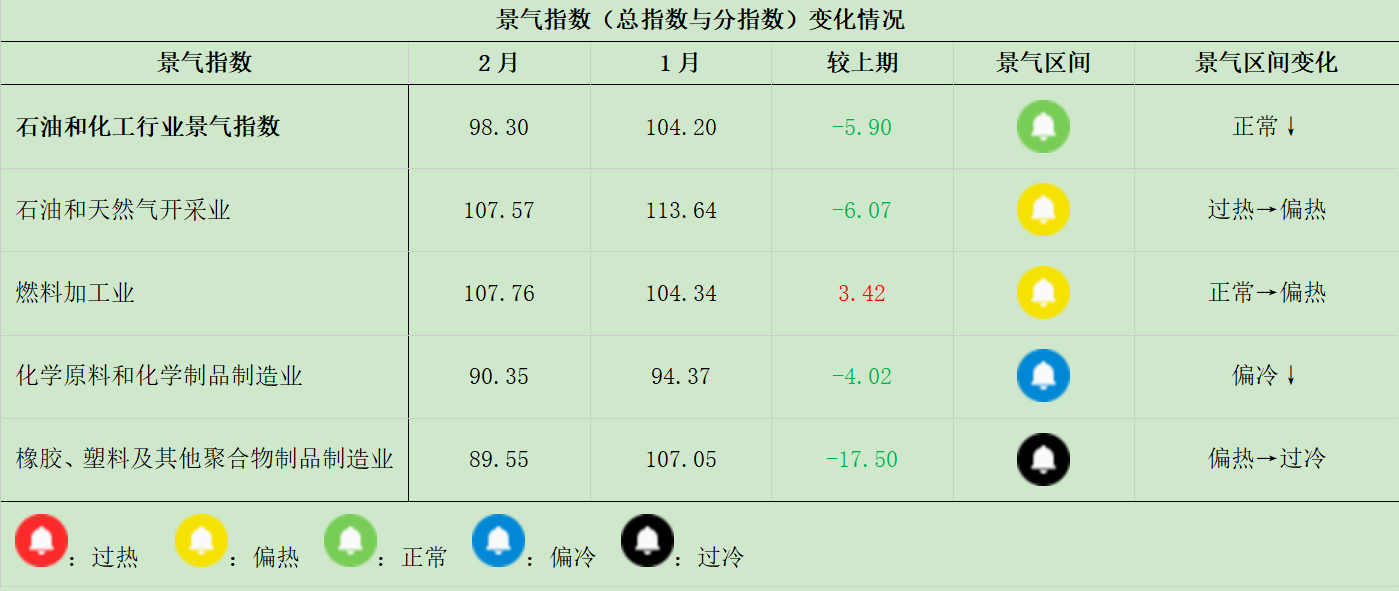 2024年2月,石油和化工行业景气指数有所回调,降至98.30,较2024年1月下降5.90个百分点,回归正常区间中间点附近;较2023年2月上涨3.19个百分点,同比增速较2024年1月回落1.63个百分点。剔除季节性因素影响,石油和天然气开采业与橡胶、塑料及其他聚合物制品制造业景气指数同比分别下降0.98个百分点和2.38个百分点;燃料加工业、化学原料和化学制品制造业景气指数同比分别增长12.66个百分点和3.13个百分点。