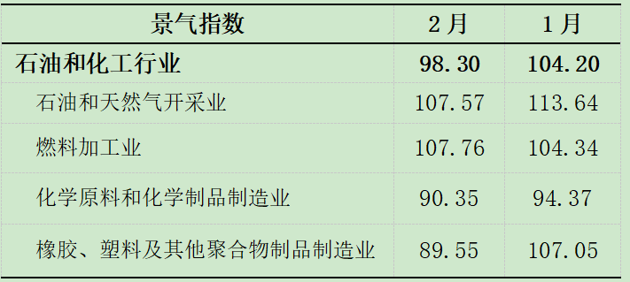 石油和化工行业景气指数在经历1月的反弹后,2024年2月回落至98.30。春节长假期间,部分中下游生产企业停工放假,1~2月全国范围内遭遇多次寒潮天气,货物运输受到一定的阻滞,生产热度、存货周转率均出现一定程度的回落,同时1月和2月国内资本市场的下行也给市场信心带来了较大的冲击,由于上述原因,2月石油和天然气开采业、化学原料和化学制品制造业以及橡胶、塑料及其他聚合物制品制造业景气指数环比分别下降6.07个百分点、4.02个百分点和17.50个百分点。春节期间,因出行需求增加,燃料加工业景气指数环比上升3.42个百分点,进入偏热区间。从整体来看,需求复苏是一个长期过程,波动在所难免。