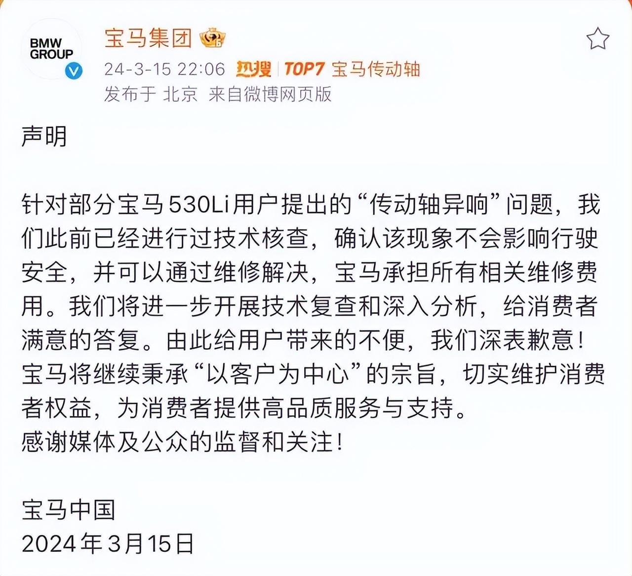 一段时间以来,部分华晨宝马5系车主发现传动轴异响,在向品牌及经销店反馈问题后得不到有效解决,经2024央视315晚会曝光后,引发了广泛的热议。