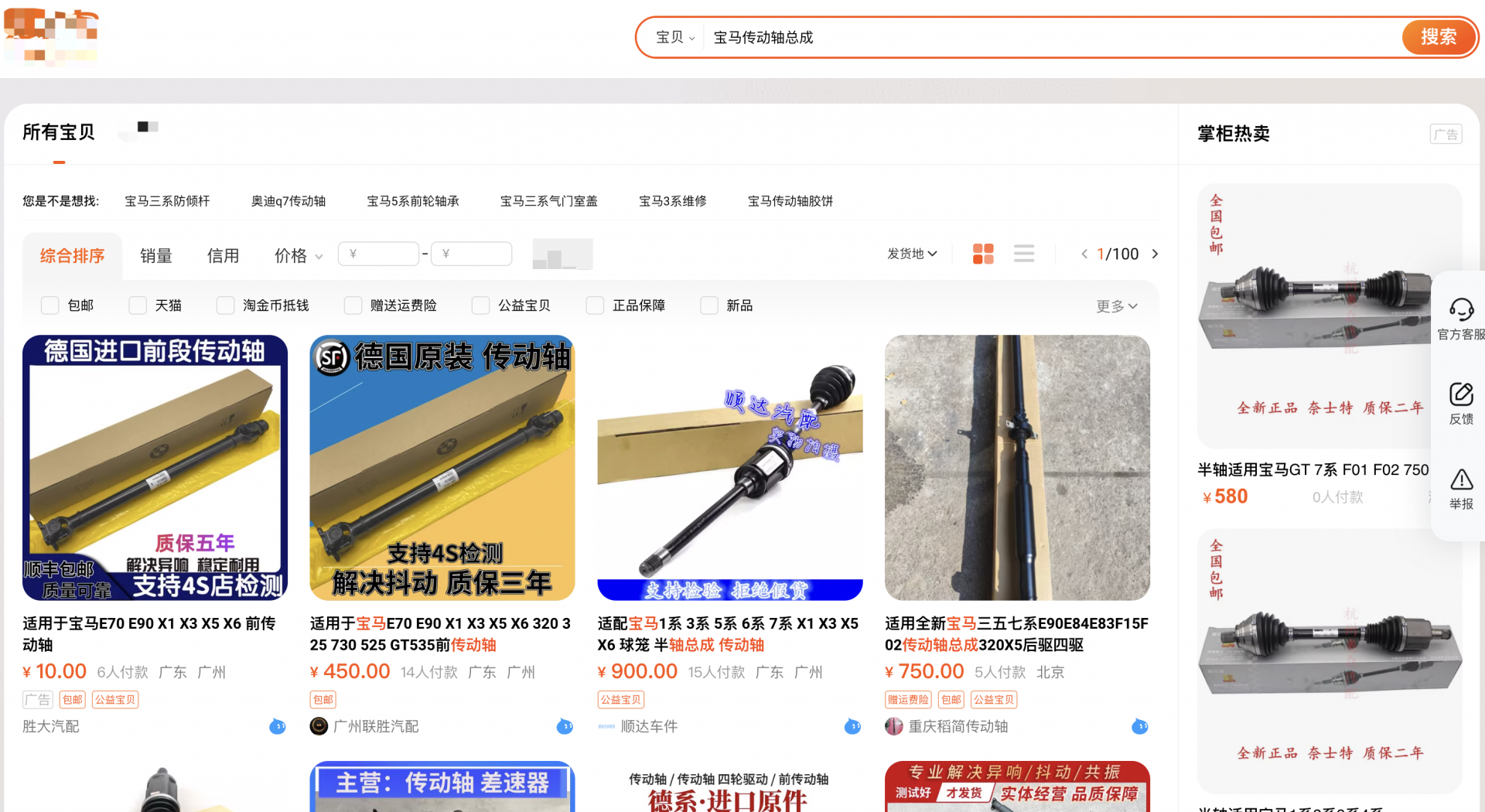 另外,在电商网站上搜索“宝马传动轴总成”的关键词,可以看到该部件的成本并不算高。