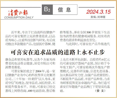 3月15日,可喜安荣登《消费日报》。《消费日报》针对可喜安的品牌实力、产品质量进行了全方面介绍,并对可喜安不断提升顾客满意度,践行诚信经营的企业担当给予了高度肯定。《消费日报》点赞可喜安“在追求品质的道路上永不止步”,并指出:“纵观可喜安整个产业链条上的经营管理,均以品质保障为第一要求,确保消费者对产品放心,对服务满意。”