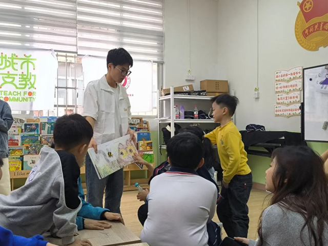广东白云学院“一本书的力量”支教团志愿者廖文莹,主张将课堂还给孩子,鼓励孩子们发挥主观能动性,通过绘本教学激发孩子们的想象力和创造性。在课堂上,她注重孩子们的表达欲,在绘本讲授环节,她更多是让孩子们主动观察绘本的情节从而发现其中的道理,在创作环节,她尽可能地给孩子们留足够的时间去完成自己的作品并鼓励他们介绍自己的作品。