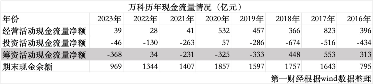 记者注意到,2018年以后,万科在筹资活动方面确实有“降杠杆”的动作。数据显示,2019~2021年,万科的筹资活动现金流量净额由正转负,分别是-333亿元、-325亿元、-231亿元,2022年尽管为正,但仅净流入34亿元,2023年该数据继续净流出368亿元。