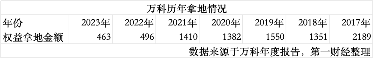 根据万科的年度报告,万科集团2018年的权益拿地金额约1351亿元,2019年,万科的权益拿地金额不降反增,至1550亿元,2020~2021年的权益拿地金额依旧维持在1400亿元的高位,直到2022年房地产市场下行,不少千亿房企债务纷纷违约,万科每年的权益拿地金额才降至500亿元左右。