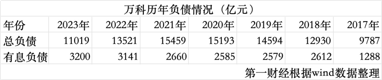 负债方面,wind平台统计的数据显示,2018年万科的总负债增至12930亿元,此后的2019年~2021年,万科每年的总负债在2018年的基础上又上了一个台阶,增至15000亿元左右,直到2022年,该数据才开始下降,2023年降至11019亿元。而有息负债方面,从2017年到2023年,则呈现每年逐步上升的趋势,即便国家层面在2020年底提出“三道红线”融资新规后,万科的有息负债余额仍然从当年底的2585亿提升至2023年底的3200亿。
